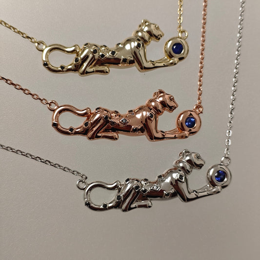Handmade S925 Silver Leopard Necklace with Natural Sapphire & Black Diamond